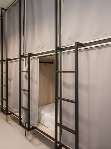 Cada cama dispone de cortina por si prefieres tener la máxima intimidad y dispone de amplias taquillas en su parte infierior con ruedas para que sea lo mas comodo el poder dejar tus pertenencias guardadas con llave.