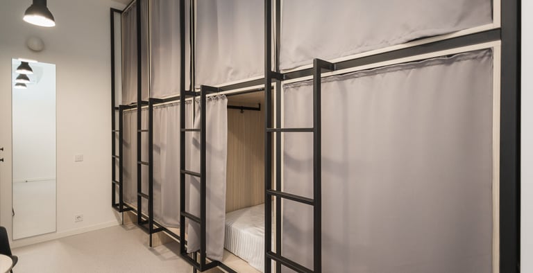 Islares Hostel dispone de dos habitaciones para 8 y 6 personas, dotadas de modernas literas que incorporan lámpara led, usb y enchufe para tus dipositivos electrónicos, además de cortinas independientes para una mayor privacidad.